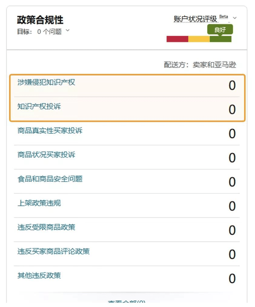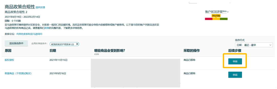 通過“商品政策合規性”頁面,您可以看到違反亞馬遜政策的商品記錄。當您看到“涉嫌侵犯知識產權” 、 “知識產權投訴” 兩欄內容有警示,則意味著可能存在侵權問題。接下來您可以對該頁面中顯示的違規問題進行申訴。